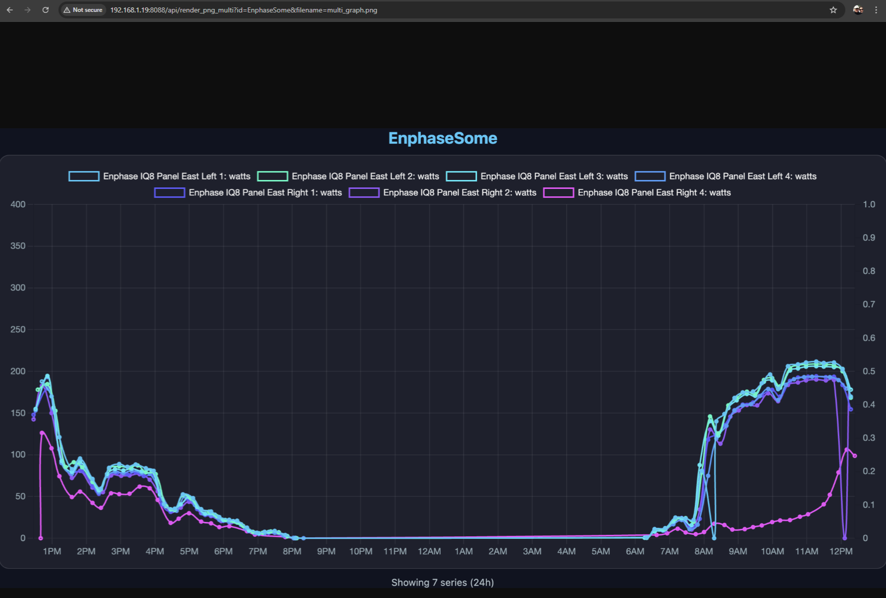 The builder page (shown in MainMulti.png) makes it easy to add multiple series and save them as a named multi graph. The multi graph viewer then displays them together (see Example_multi.png).