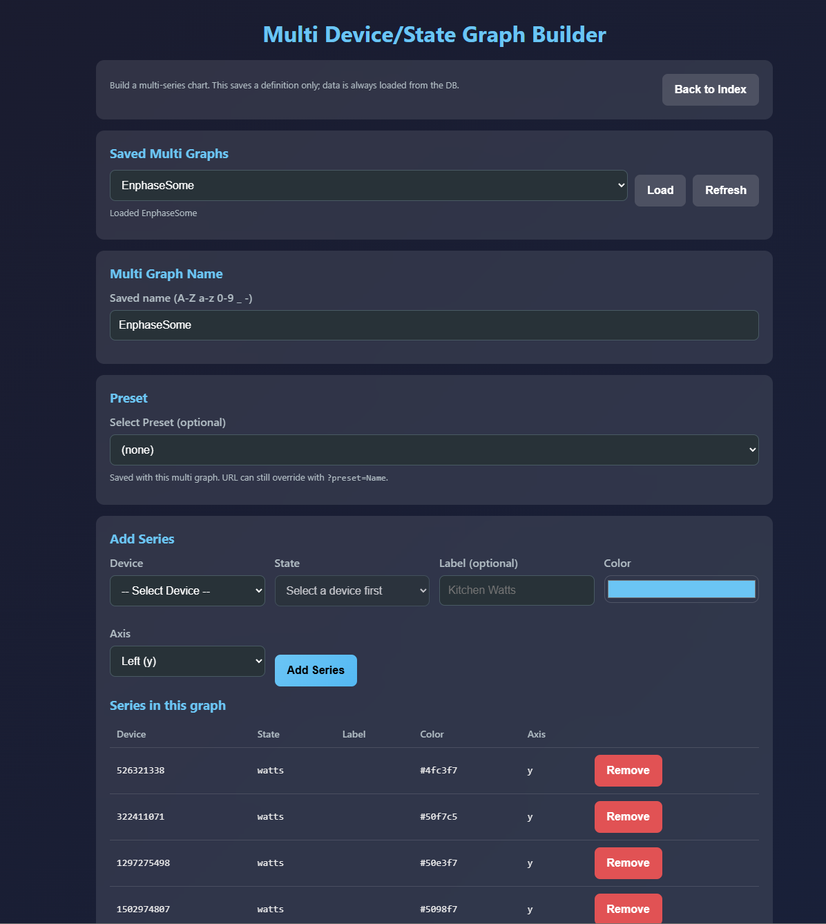 Multi graphs let you combine several device states into a single chart (for example, multiple “watts” states on the same chart, or a left/right axis pairing such as temperature + power).