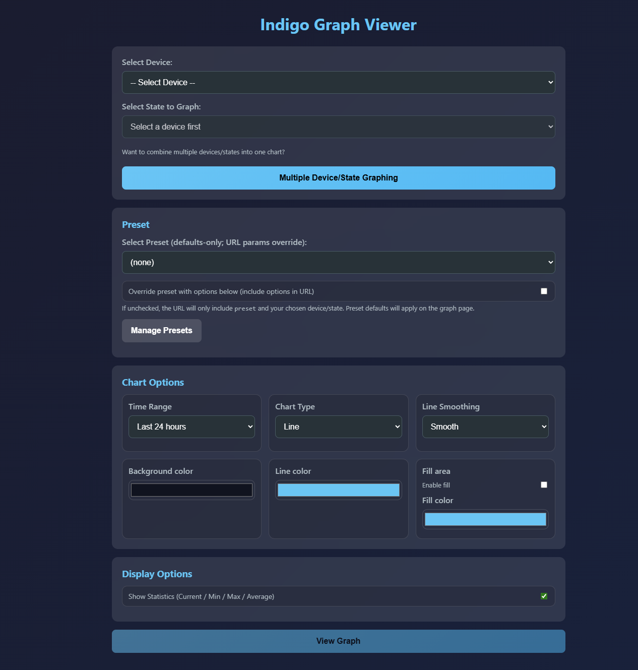 Deluxe Graphing is an Indigo plugin that provides a simple local web app for viewing historical Indigo device state data as charts (from a PostgreSQL-backed history table). It can also generate PNGs on demand, making it ideal for wall/tablet dashboards and Indigo Control Pages.